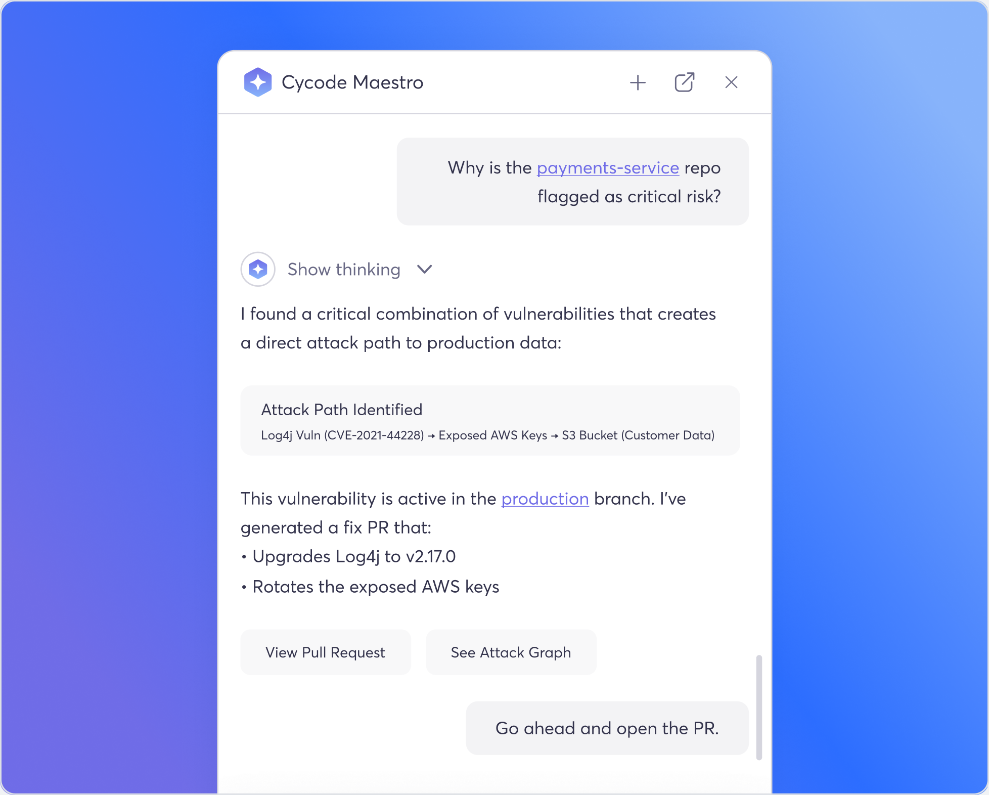 Built on Cycode’s Context Intelligence Graph, Maestro understands your codebase, pipeline, and risk posture before taking action.