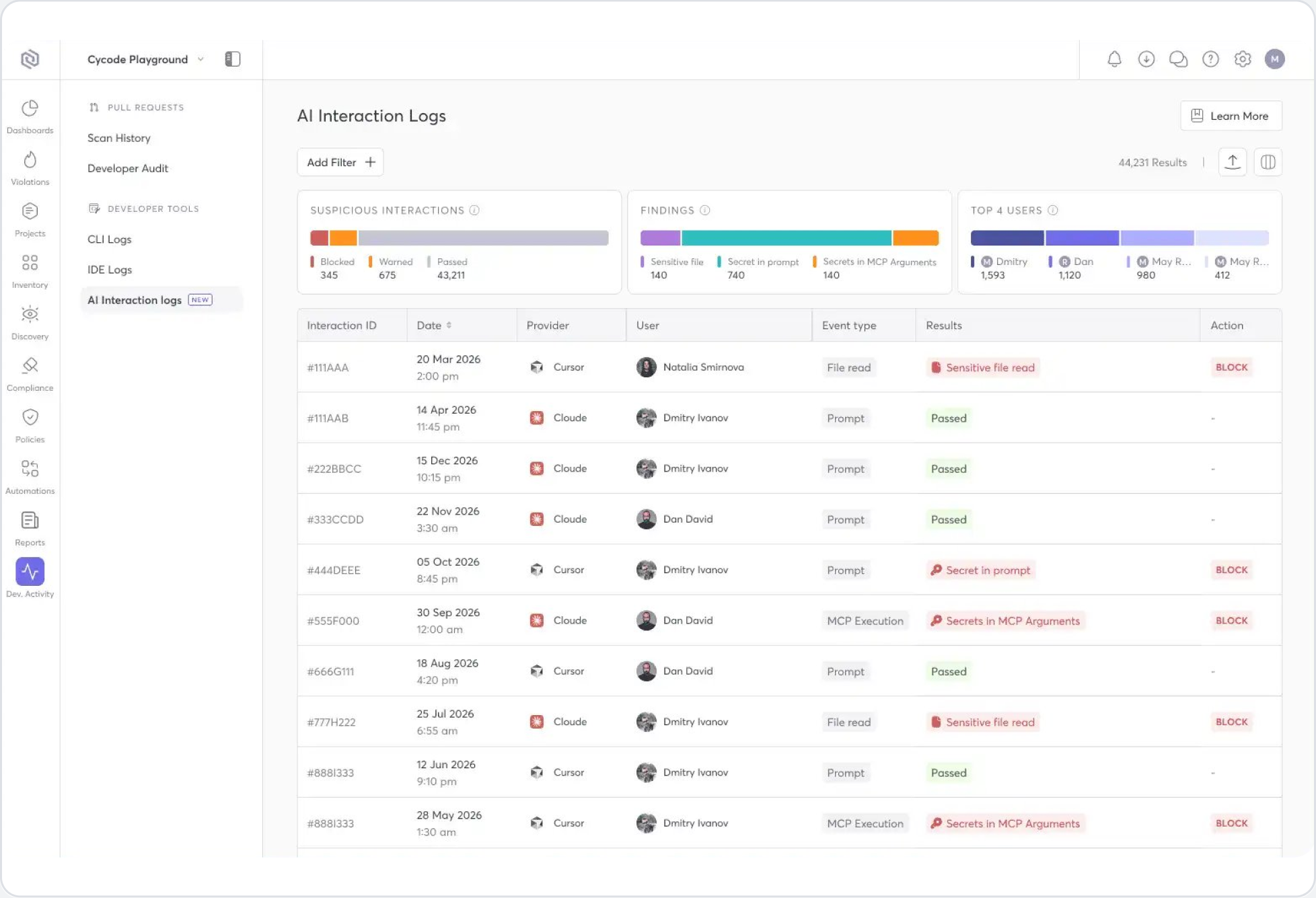 Every AI risk is traceable to the specific project, repository, and developer responsible.