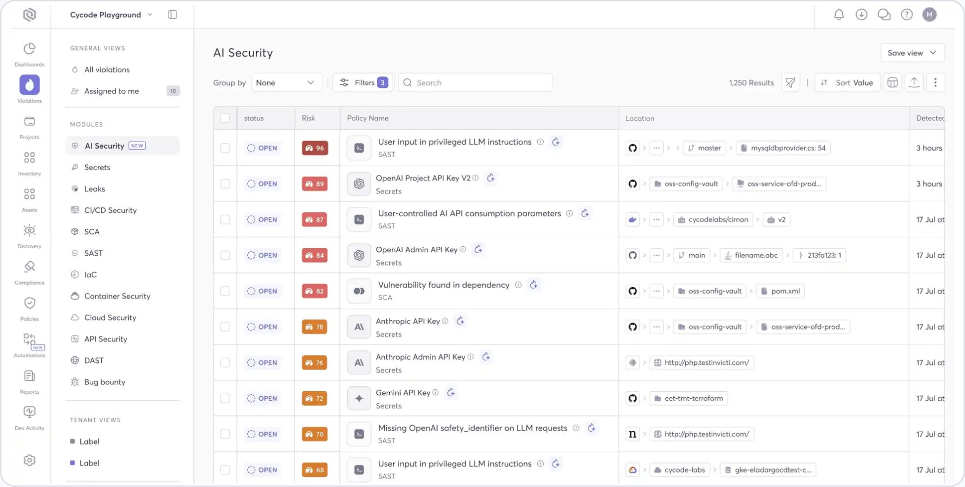 LLM injection risks, exposed AI API keys, vulnerable AI dependencies, and unsafe AI integrations — all in one prioritized queue.